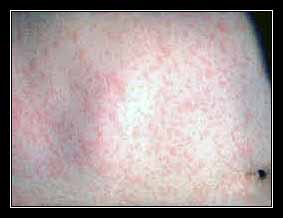 Trên da nổi mụn đỏ có thể giống như loại ban của bệnh sởi, nhưng không có nội ban đặc trưng của bệnh sởi và đặc biệt không có dấu hiệu Koplick.
