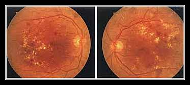 - Xơ cứng tuần tiến các mạch võng mạc. Biểu hiện bằng giảm từ từ và toàn bộ chức năng võng mạc. Soi đáy mắt thấy trạng thái thiếu máu cục bộ và hẹp lòng các mạch máu. Đôi khi, tùy theo mức độ bệnh của mạch máu có thể có huyết khối động mạch với tiên lượng xấu vì võng mạc thiếu máu hoàn toàn, có thể trong không đầy một giờ gây những thương tổn không thể phục hồi được. Huyết khối tĩnh mạch tuy không nguy hiểm bằng, nhưng cũng làm giảm nhiều thị giác.